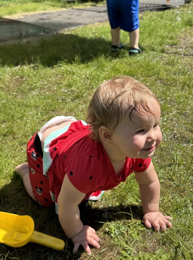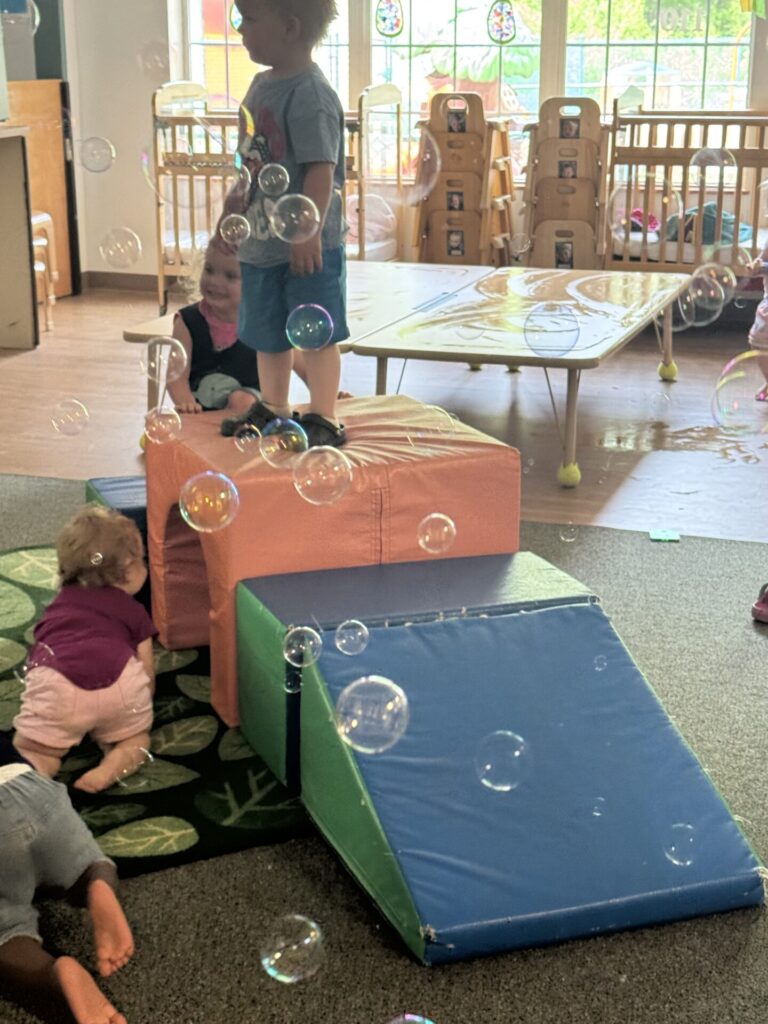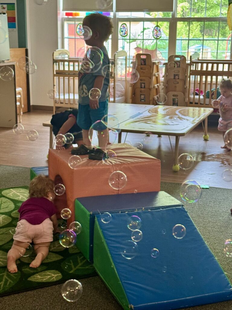 Back inside, bubbles turned the playroom into a sparkling adventure! Toddlers crawled through drifting orbs while older friends popped bubbles on foam blocks. As many adventures as a day can have!