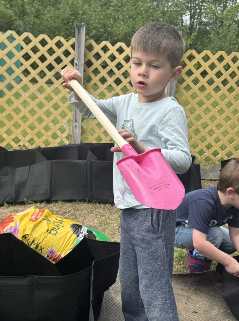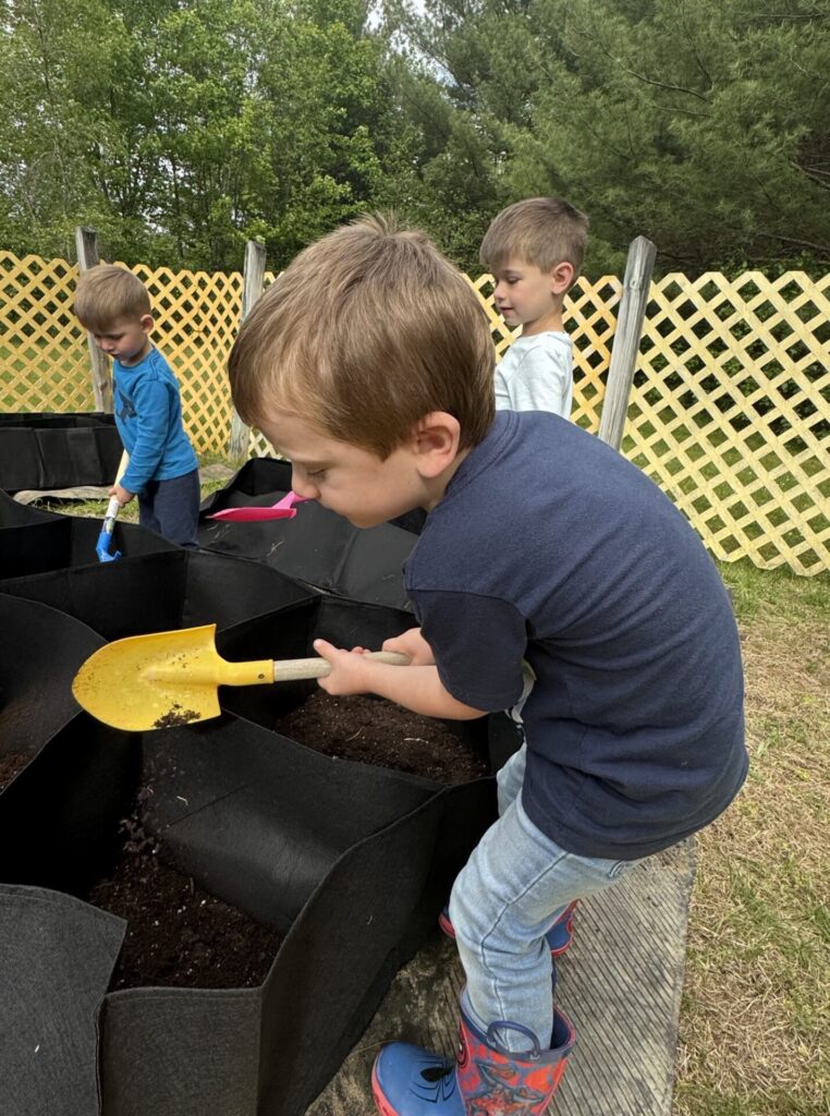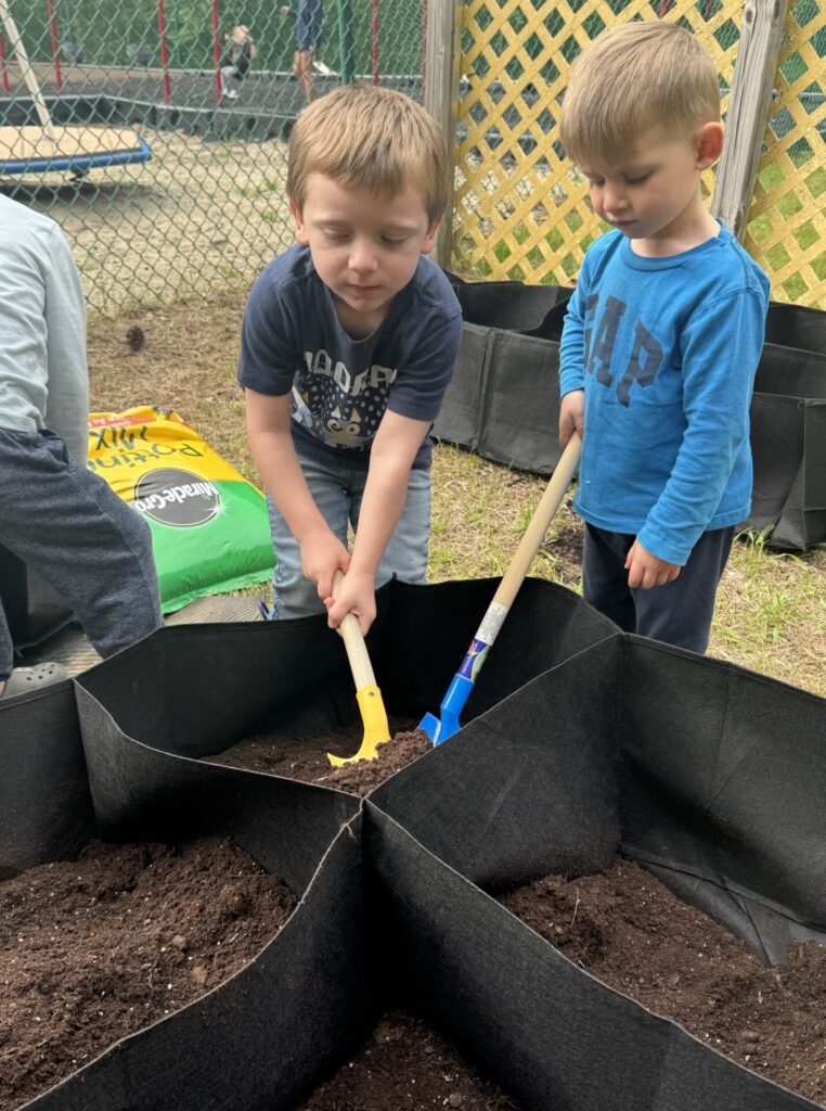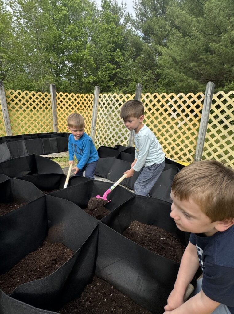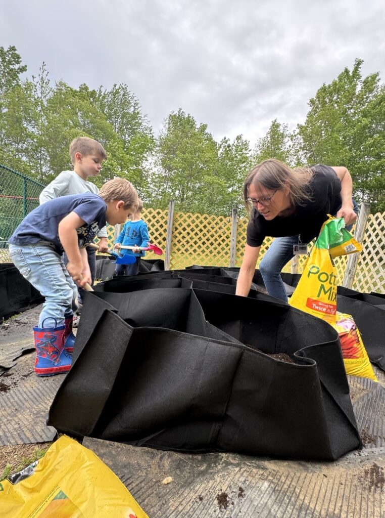 Outside, our kiddos scooped soil into fabric planters, learning about growing seeds as they filled each pocket.
